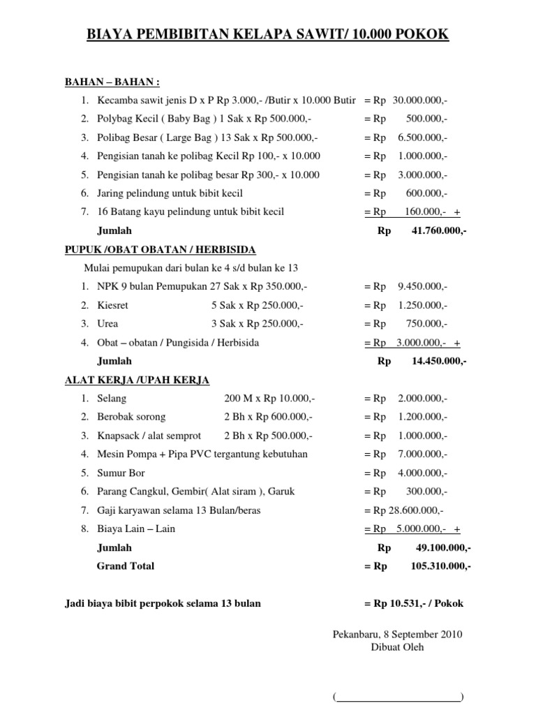 Biaya Pembibitan Kelapa Sawit