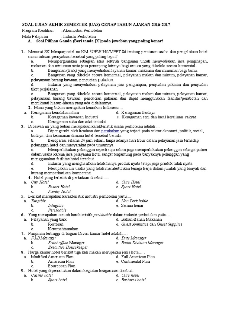 Soal Uas Industri Perhotelan Smt Genap 2016-2017