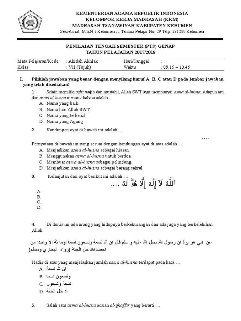 Soal Pilihan Ganda Tentang Asmaul Husna Beserta Jawaban - Guru …