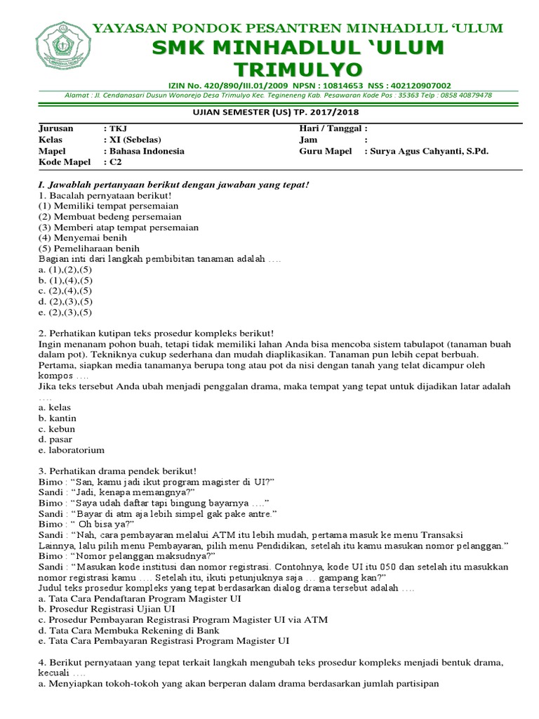 PENILAIAN AKHIR SEMESTER GANJIL – BAHASA INDONESIA KELAS XI | pkbmbhinnekalamtim.net